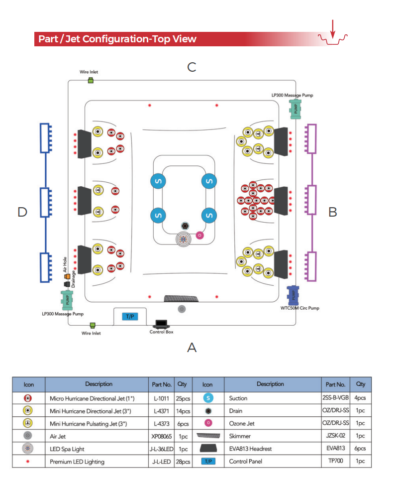 Den totala upplevelsen förstärks av detaljer som upplyst vattenfall, stämningsfull LED-belysning och genomtänkt placering av massagejets – allt framtaget för att skapa en harmonisk och lyxig spabadsmiljö.