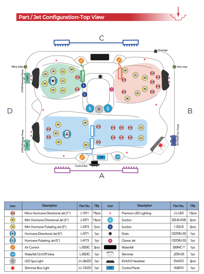 Den totala upplevelsen förstärks av detaljer som upplyst vattenfall, stämningsfull LED-belysning och genomtänkt placering av massagejets – allt framtaget för att skapa en harmonisk och lyxig spabadsmiljö.
